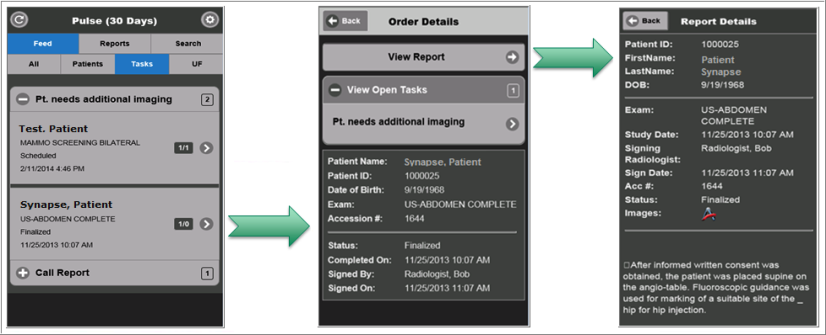 From the Pulse, users may review and complete open tasks and urgent findings, therefore removing the entries from the respective worklists within the SynComm Landing.