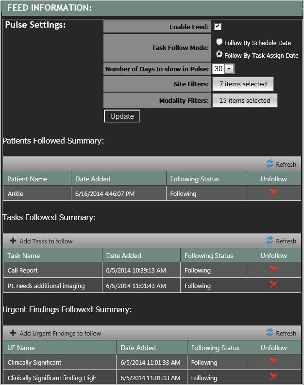 - All: Displays all data being actively 'followed' by the user including patients, tasks, & urgent findings (UF)